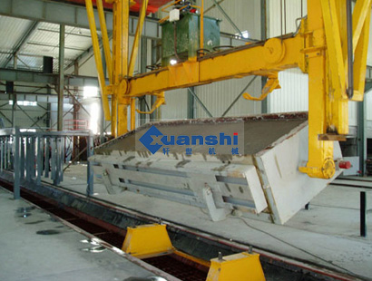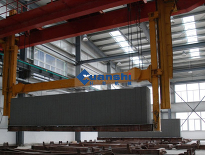 翻轉(zhuǎn)吊具是加氣混凝土生產(chǎn)設(shè)備中主要配套設(shè)備,翻轉(zhuǎn)吊具將坯體(帶模具和側(cè)板)在空中翻轉(zhuǎn)90度,吊放在切割臺或切割小車上,脫去模框,坯體即能切割。