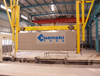 1、將澆注養(yǎng)護后的坯體帶?蚝蛡(cè)板凌空吊起,翻轉(zhuǎn)90度(坯體已直立),吊放至切割臺進行開模、脫模。吊去模框,坯體即能切割。