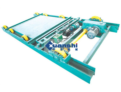 擺渡車是各類蒸養(yǎng)制品廠成型工段連接蒸養(yǎng)工段換向拖動不可少的設備.該車具有拖動、頂推強勁有力的特點.大車橫向快速移動后能夠準確的停止、定位和接軌,大車載重運行時可變頻慢速運行,空車回程時可變頻快速。擺渡車上還設有縱向動力裝置,可以拖動、頂推滿載3噸制品的蒸養(yǎng)小車20輛。