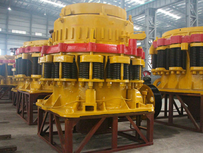 破碎腔型式由礦石用途決定:標(biāo)準(zhǔn)型適用于中碎,中型適用于細(xì)碎,短頭型適用于超細(xì)碎。本機(jī)主要由機(jī)架、傳動(dòng)、空偏心軸、碗形軸承、破碎圓錐、調(diào)整裝置、調(diào)整套、彈簧以及調(diào)整排礦口用的液壓站等部分組成。破碎機(jī)工作時(shí),電動(dòng)機(jī)通過(guò)水平軸和一對(duì)傘齒輪帶動(dòng)偏心軸套旋轉(zhuǎn),破碎圓錐軸心線在偏心軸套的迫動(dòng)下做旋擺運(yùn)動(dòng),使得破碎壁表面時(shí)而靠近又時(shí)而離開(kāi)軋臼壁的表面,從而使礦石在破碎腔內(nèi)不斷地受到擠壓和彎曲而被破碎。