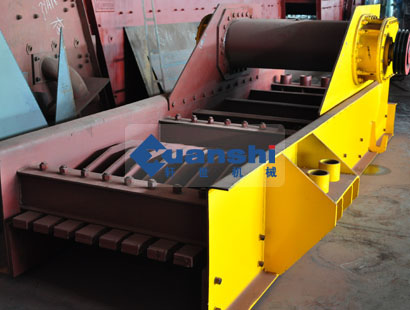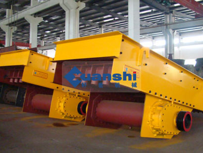 該機采用雙偏心軸激振器的結構特點,保證設備能承受大塊物料下落的沖擊, 給料能力大。在生產流程中可以把塊狀、顆粒狀物料從貯料倉中均勻、定時、連續(xù)地給到受料裝置中去,從而防止受料裝置因進料不均而產生死機的現象,延長了設備使用壽命。給料機可分為鋼板結構和篦條結構,鋼板結構的給料機多用于砂石生產線,將物料全部均勻地送入破碎設備;篦條結構的給料機可對物料進行粗篩分使系統(tǒng)在配制上更經濟合理,在破碎篩分中已作為必不可少的設備。